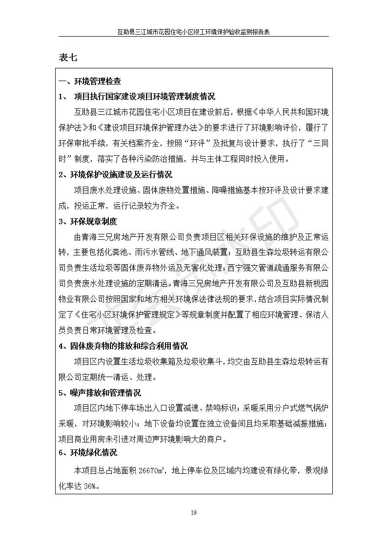 根據(jù)中華人民共和國國務院令第682號《國務院關于修改〈建設項目環(huán)境保護管理條例〉的決定》和《建設項目竣工環(huán)境保護驗收暫行辦法》(國務院令682號),互助縣三江城市花園住宅小區(qū)(包括竣工環(huán)境保護驗收監(jiān)測報告表和驗收意見)公示如下。 一、項目名稱: 互助縣三江城市花園住宅小區(qū)竣工環(huán)境保護驗收監(jiān)測報告表 二、地點:青海省海東市互助土族自治縣威遠鎮(zhèn)安定路與和諧路交匯處東南角 三、建設單位:青海三兄房地產(chǎn)開發(fā)有限公司 四、建設內(nèi)容:項目規(guī)劃用地面積26670.0m2,實際占地面積26670.0m2,項目占地面積未發(fā)生變化,規(guī)劃設計建筑總面積76616.4m2,其中商業(yè)建筑面積8994m2。實際建筑總面積58639.64m2,其中商業(yè)建筑面積9894.27m2。 五、聯(lián)系人:張工 六、聯(lián)系電 話:0971-6515411 七、公示時間:二〇一九年六月五日至二〇一九年七月三日 公示期間,對上述公示內(nèi)容如有異議,請以書面形式反饋,個人須署真實姓名,單位須加蓋公章。