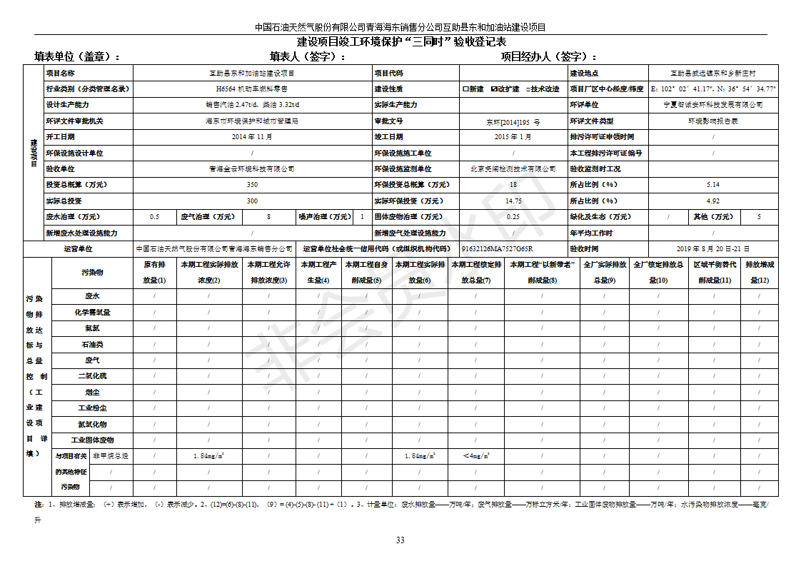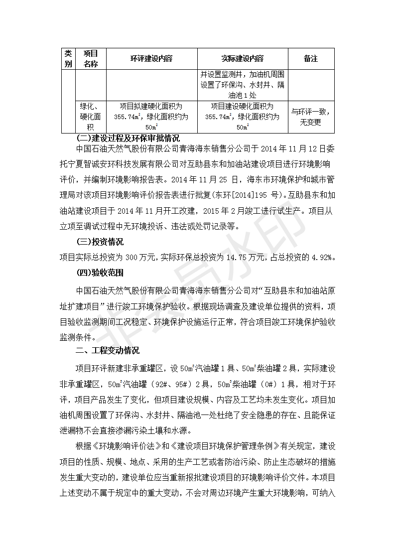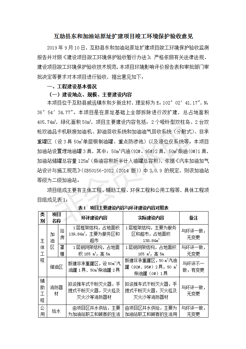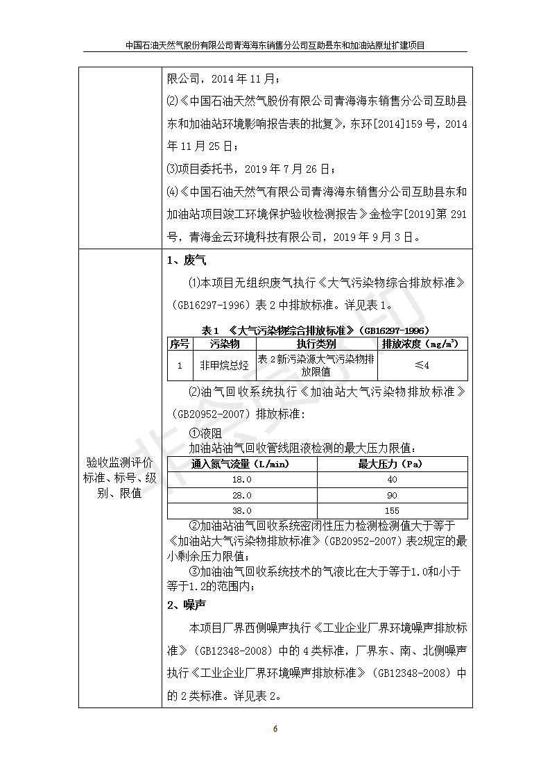 根據(jù)中華人民共和國國務(wù)院令第682號(hào)《國務(wù)院關(guān)于修改〈建設(shè)項(xiàng)目環(huán)境保護(hù)管理?xiàng)l例〉的決定》和《建設(shè)項(xiàng)目竣工環(huán)境保護(hù)驗(yàn)收暫行辦法》(國務(wù)院令682號(hào)),互助縣東和加油站原址擴(kuò)建項(xiàng)目(包括竣工環(huán)境保護(hù)驗(yàn)收監(jiān)測報(bào)告表和驗(yàn)收意見)公示如下。 一、項(xiàng)目名稱:互助縣東和加油站原址擴(kuò)建項(xiàng)目 二、地點(diǎn):互助縣威遠(yuǎn)鎮(zhèn)東和鄉(xiāng)新莊村 六、聯(lián)系電話:0971-6515411 七、公示時(shí)間:二〇一九年九月二十七日至二〇一九年十月二十九日 公示期間,對(duì)上述公示內(nèi)容如有異議,請(qǐng)以書面形式反饋,個(gè)人須署真實(shí)姓名,單位須加蓋公章。