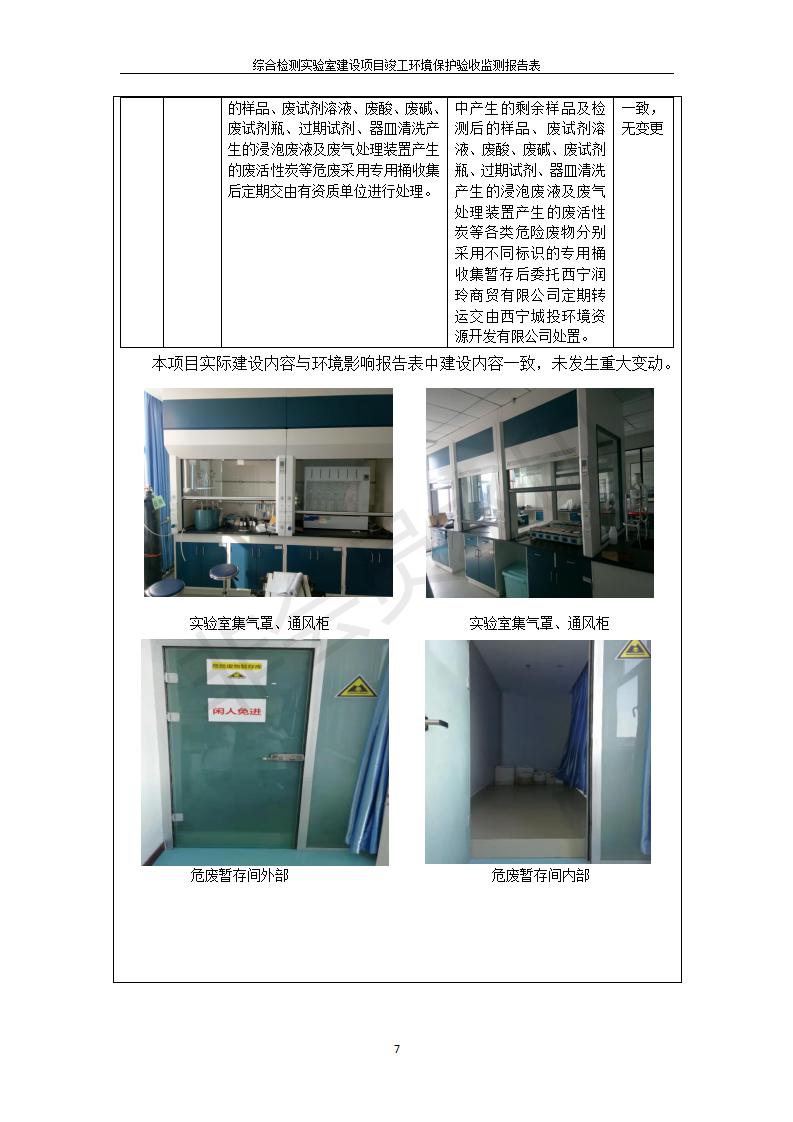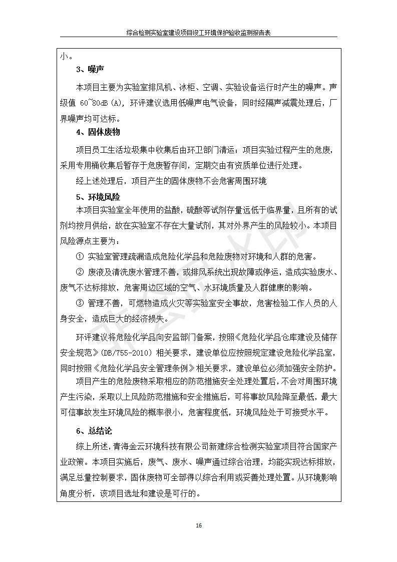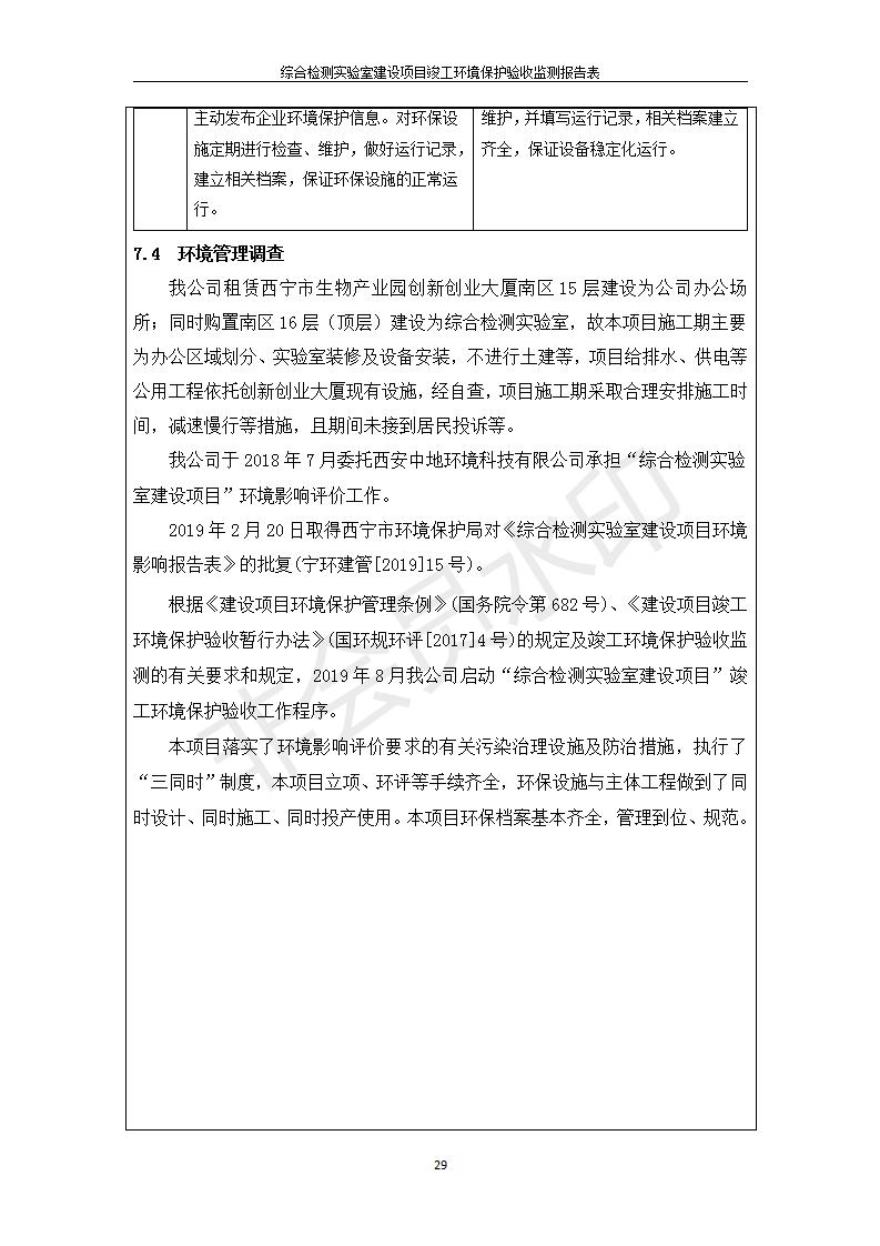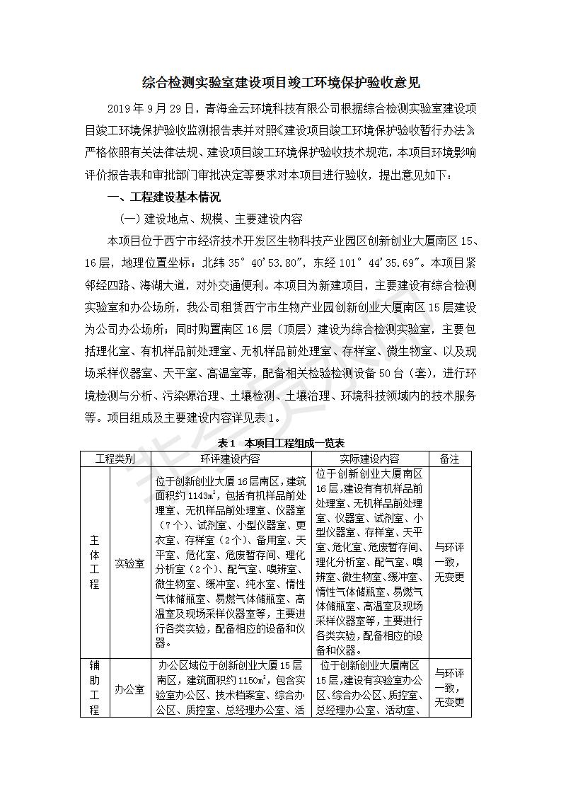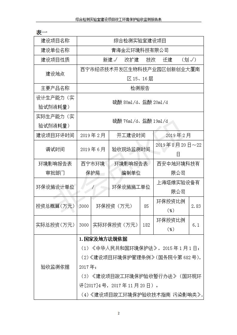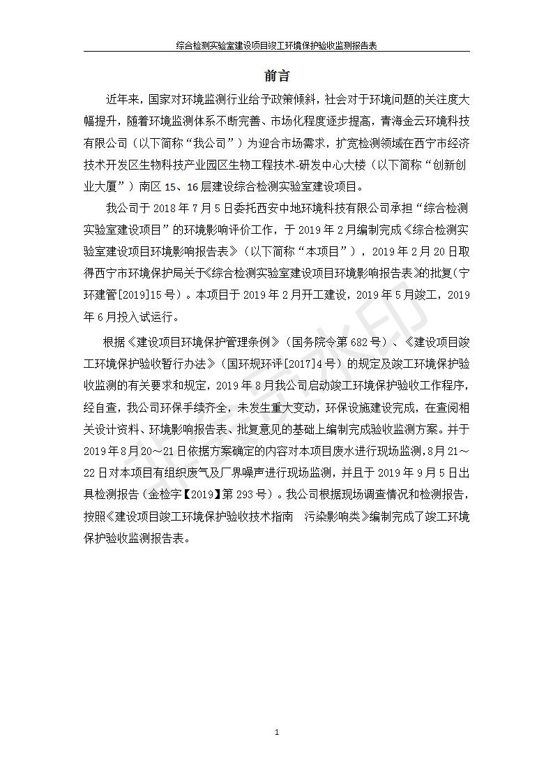 根據(jù)中華人民共和國(guó)國(guó)務(wù)院令第682號(hào)《國(guó)務(wù)院關(guān)于修改〈建設(shè)項(xiàng)目環(huán)境保護(hù)管理?xiàng)l例〉的決定》和《建設(shè)項(xiàng)目竣工環(huán)境保護(hù)驗(yàn)收暫行辦法》(國(guó)務(wù)院令682號(hào)),綜合檢測(cè)實(shí)驗(yàn)室建設(shè)項(xiàng)目(包括竣工環(huán)境保護(hù)驗(yàn)收監(jiān)測(cè)報(bào)告表和驗(yàn)收意見(jiàn))公示如下。 一、項(xiàng)目名稱:綜合檢測(cè)實(shí)驗(yàn)室建設(shè)項(xiàng)目 二、地點(diǎn):西寧市經(jīng)濟(jì)技術(shù)開(kāi)發(fā)區(qū)生物科技產(chǎn)業(yè)園區(qū)創(chuàng)新創(chuàng)業(yè)大廈南區(qū)15、16層 六、聯(lián)系電話:0971-6515411 七、公示時(shí)間:二〇一九年十一月十九日至二〇一九年十二月十六日 公示期間,對(duì)上述公示內(nèi)容如有異議,請(qǐng)以書(shū)面形式反饋,個(gè)人須署真實(shí)姓名,單位須加蓋公章。
