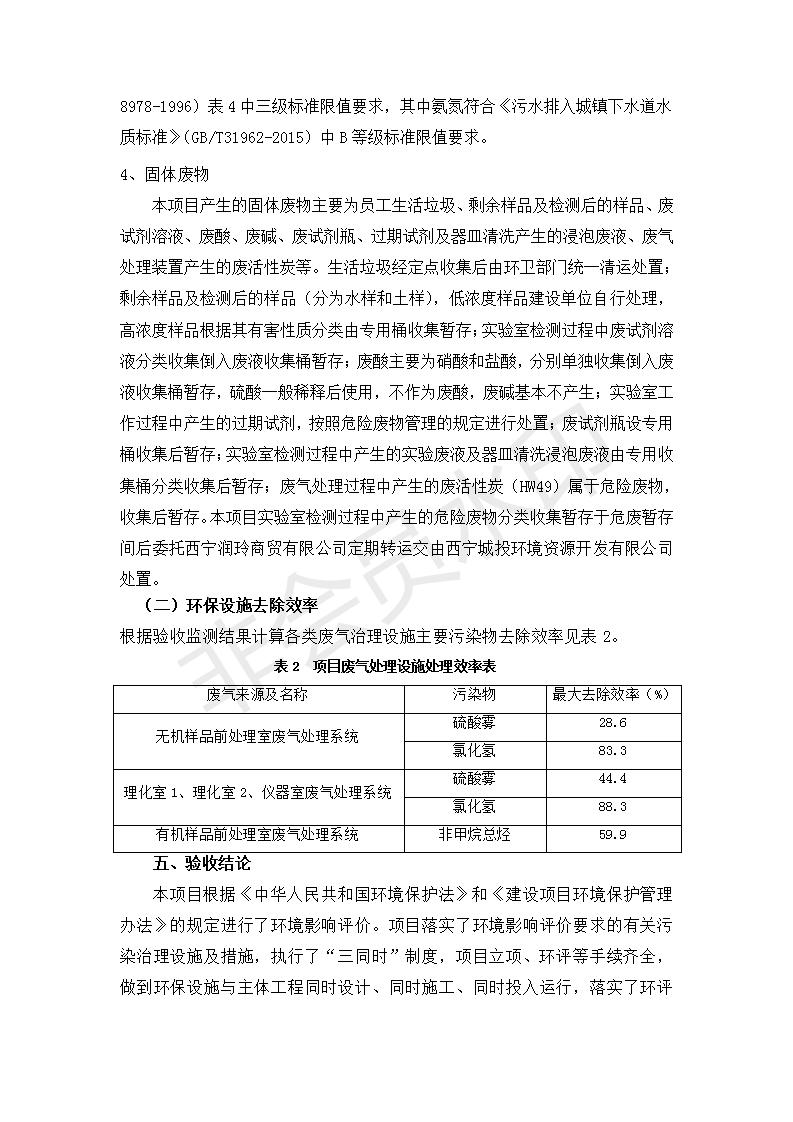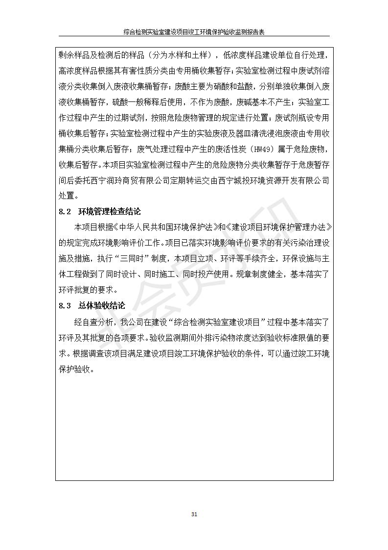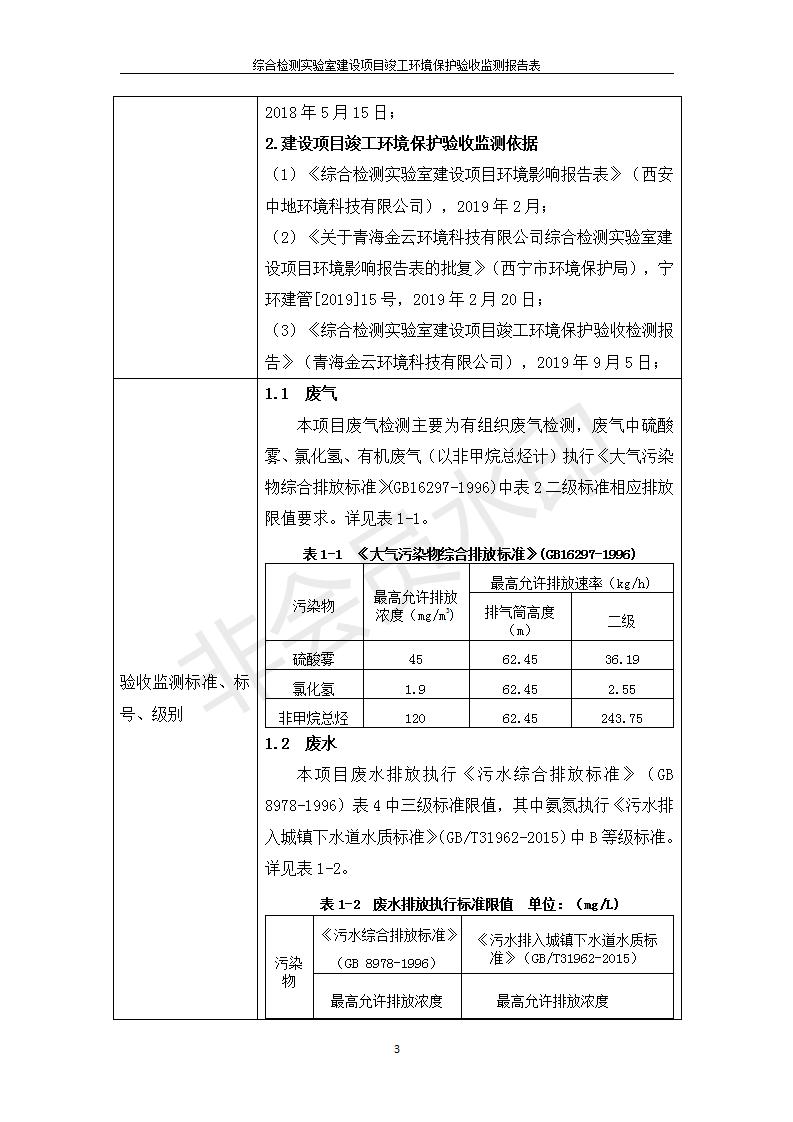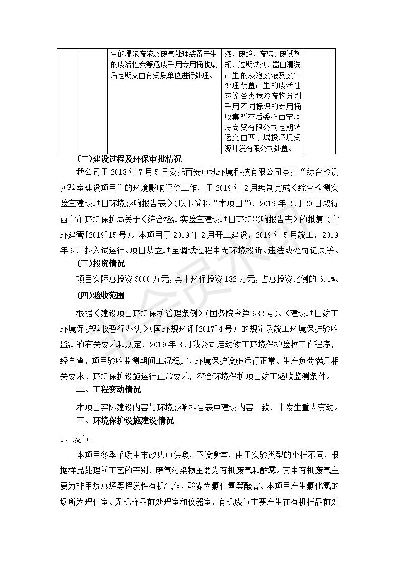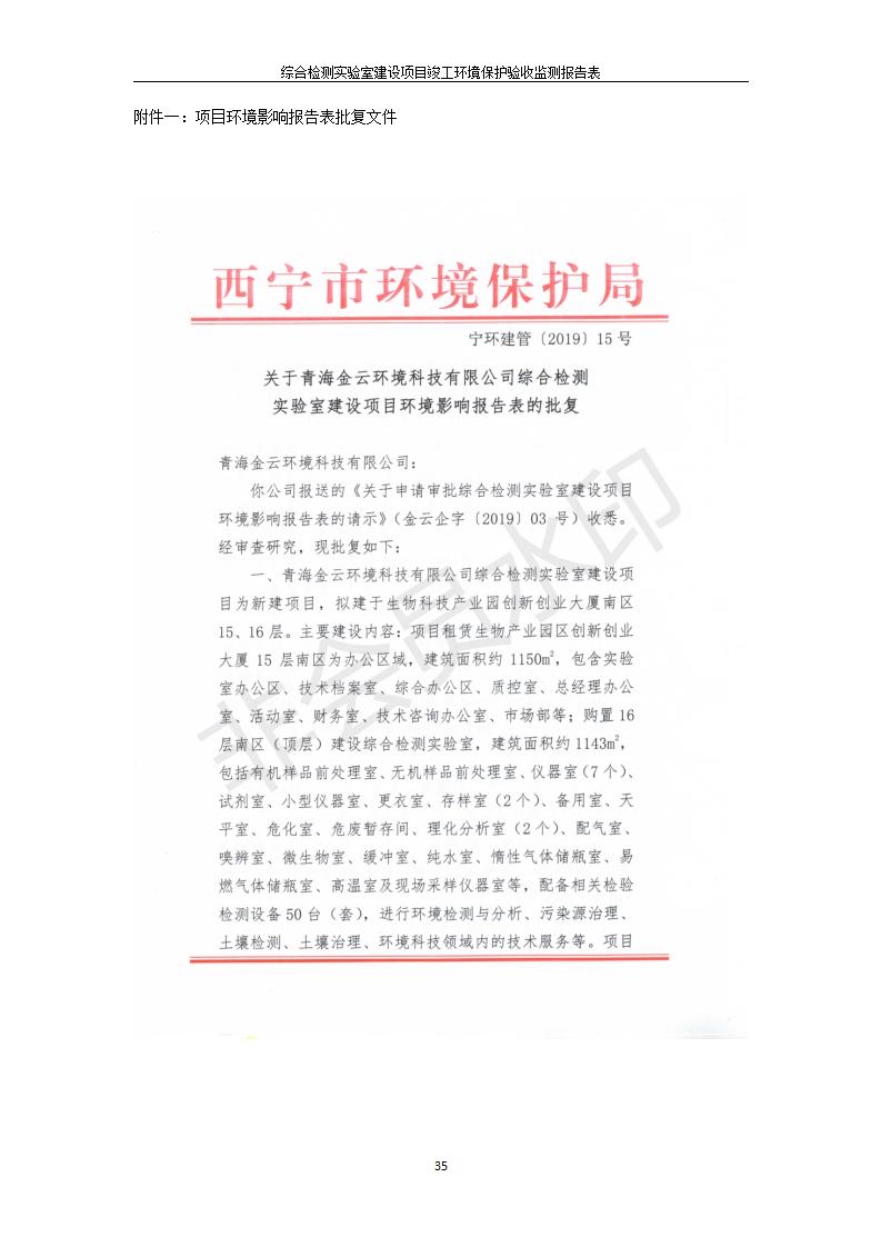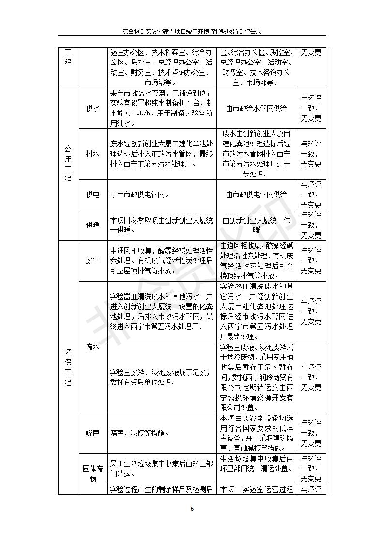 根據(jù)中華人民共和國(guó)國(guó)務(wù)院令第682號(hào)《國(guó)務(wù)院關(guān)于修改〈建設(shè)項(xiàng)目環(huán)境保護(hù)管理?xiàng)l例〉的決定》和《建設(shè)項(xiàng)目竣工環(huán)境保護(hù)驗(yàn)收暫行辦法》(國(guó)務(wù)院令682號(hào)),綜合檢測(cè)實(shí)驗(yàn)室建設(shè)項(xiàng)目(包括竣工環(huán)境保護(hù)驗(yàn)收監(jiān)測(cè)報(bào)告表和驗(yàn)收意見(jiàn))公示如下。 一、項(xiàng)目名稱:綜合檢測(cè)實(shí)驗(yàn)室建設(shè)項(xiàng)目 二、地點(diǎn):西寧市經(jīng)濟(jì)技術(shù)開(kāi)發(fā)區(qū)生物科技產(chǎn)業(yè)園區(qū)創(chuàng)新創(chuàng)業(yè)大廈南區(qū)15、16層 六、聯(lián)系電話:0971-6515411 七、公示時(shí)間:二〇一九年十一月十九日至二〇一九年十二月十六日 公示期間,對(duì)上述公示內(nèi)容如有異議,請(qǐng)以書(shū)面形式反饋,個(gè)人須署真實(shí)姓名,單位須加蓋公章。