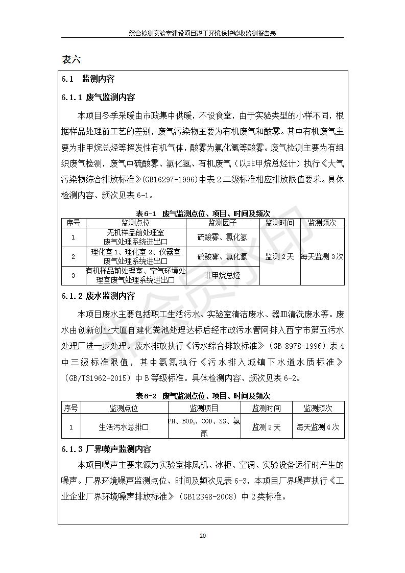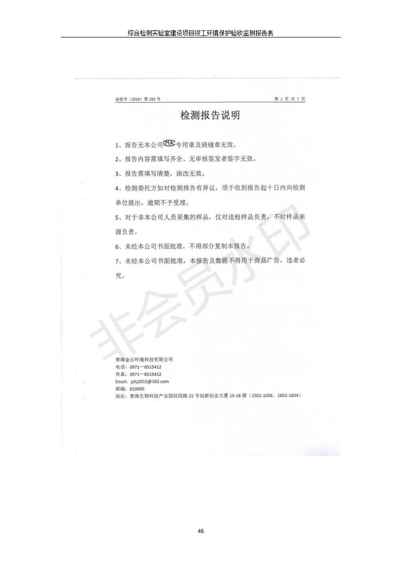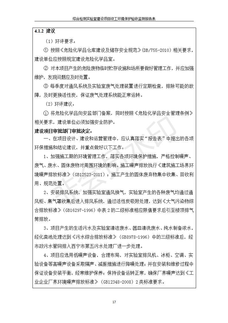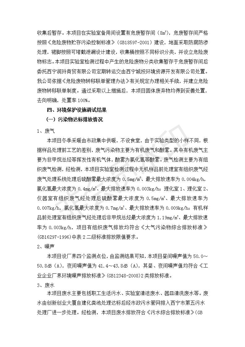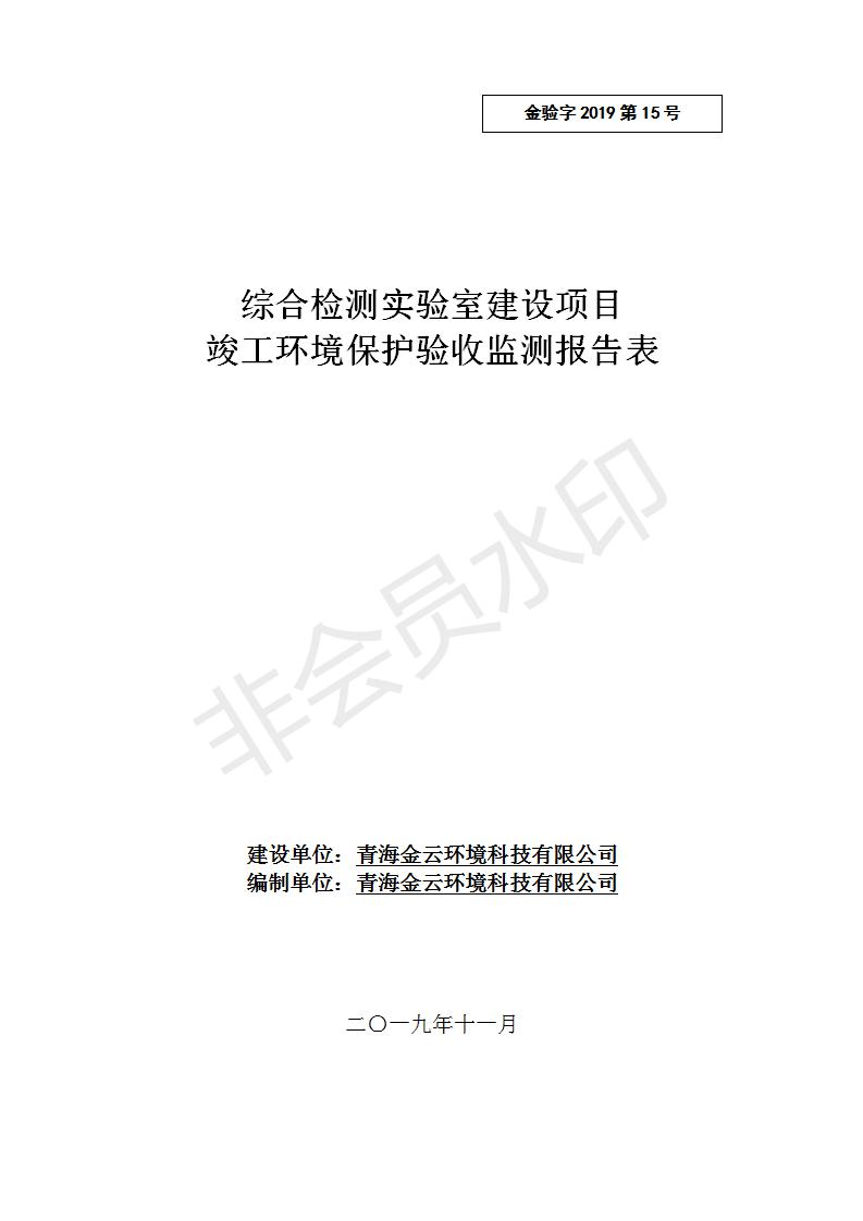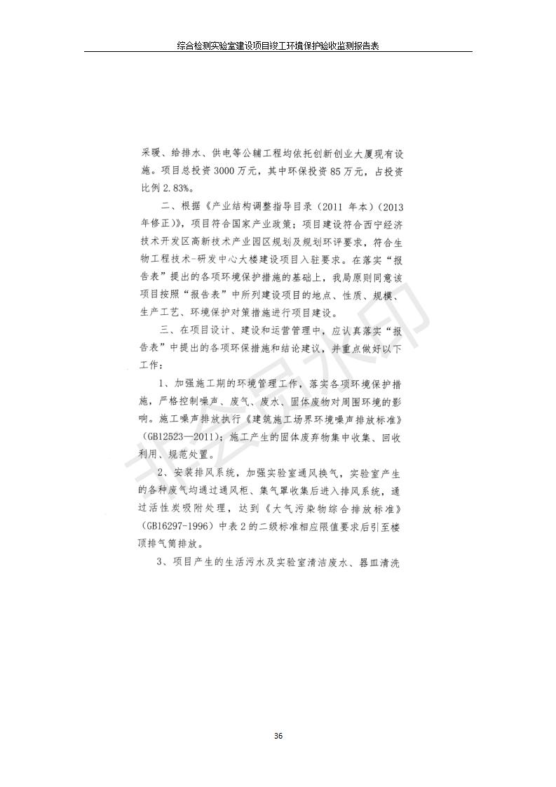 根據(jù)中華人民共和國(guó)國(guó)務(wù)院令第682號(hào)《國(guó)務(wù)院關(guān)于修改〈建設(shè)項(xiàng)目環(huán)境保護(hù)管理?xiàng)l例〉的決定》和《建設(shè)項(xiàng)目竣工環(huán)境保護(hù)驗(yàn)收暫行辦法》(國(guó)務(wù)院令682號(hào)),綜合檢測(cè)實(shí)驗(yàn)室建設(shè)項(xiàng)目(包括竣工環(huán)境保護(hù)驗(yàn)收監(jiān)測(cè)報(bào)告表和驗(yàn)收意見(jiàn))公示如下。 一、項(xiàng)目名稱:綜合檢測(cè)實(shí)驗(yàn)室建設(shè)項(xiàng)目 二、地點(diǎn):西寧市經(jīng)濟(jì)技術(shù)開(kāi)發(fā)區(qū)生物科技產(chǎn)業(yè)園區(qū)創(chuàng)新創(chuàng)業(yè)大廈南區(qū)15、16層 六、聯(lián)系電話:0971-6515411 七、公示時(shí)間:二〇一九年十一月十九日至二〇一九年十二月十六日 公示期間,對(duì)上述公示內(nèi)容如有異議,請(qǐng)以書(shū)面形式反饋,個(gè)人須署真實(shí)姓名,單位須加蓋公章。