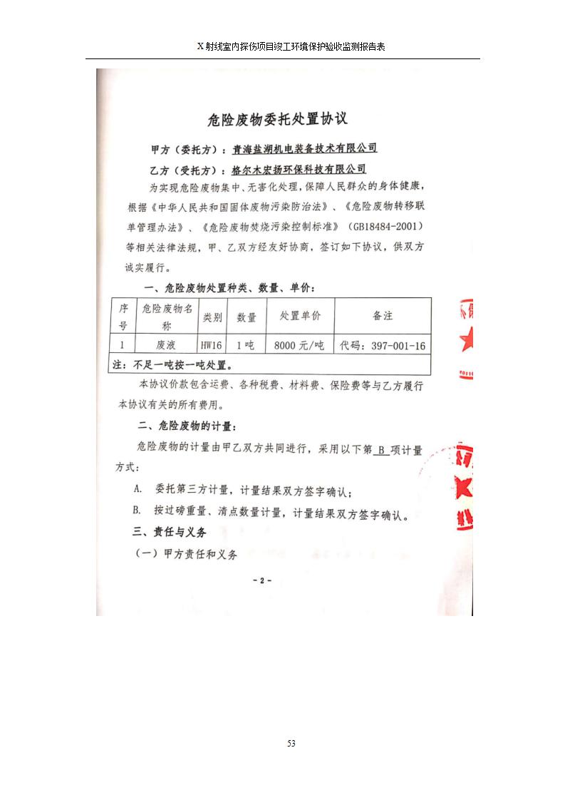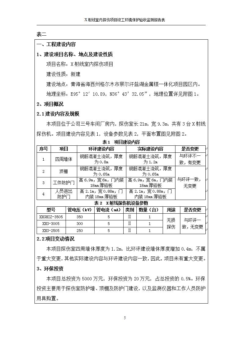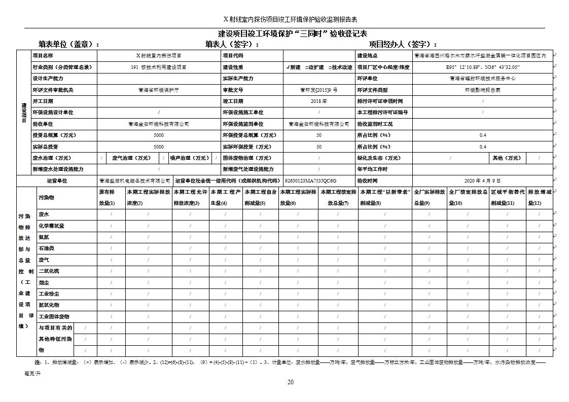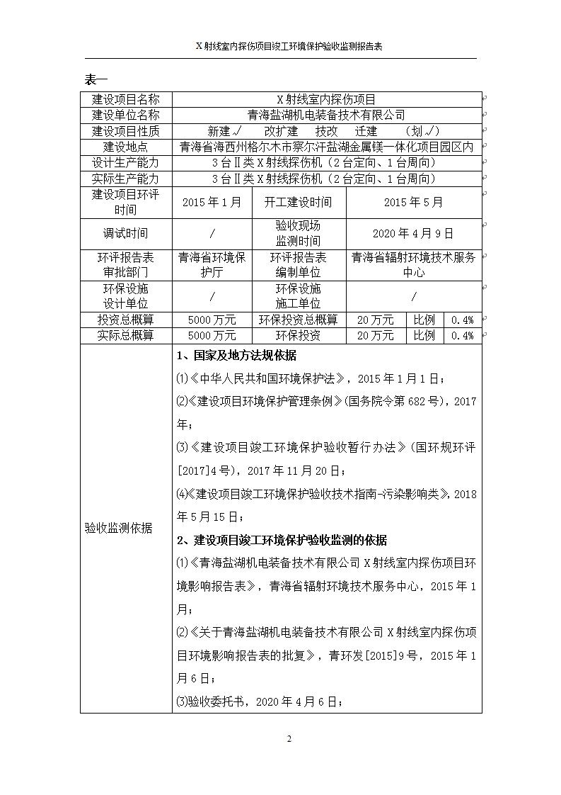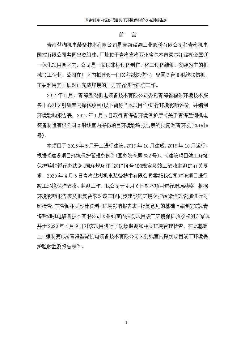 根據(jù)中華人民共和國國務(wù)院令第682號《國務(wù)院關(guān)于修改〈建設(shè)項(xiàng)目環(huán)境保護(hù)管理?xiàng)l例〉的決定》和《建設(shè)項(xiàng)目竣工環(huán)境保護(hù)驗(yàn)收暫行辦法》(國務(wù)院令682號),青海鹽湖機(jī)電裝備技術(shù)有限公司X射線室內(nèi)探傷項(xiàng)目竣工環(huán)境保護(hù)驗(yàn)收監(jiān)測報(bào)告表公示如下。 一、項(xiàng)目名稱:X射線室內(nèi)探傷項(xiàng)目竣工環(huán)境保護(hù)驗(yàn)收監(jiān)測報(bào)告表 二、地點(diǎn):青海省海西州格爾木市察爾汗鹽湖金屬鎂一體化項(xiàng)目園區(qū)內(nèi) 三、建設(shè)單位:青海鹽湖機(jī)電裝備技術(shù)有限公司 四、建設(shè)內(nèi)容:本項(xiàng)目位于公司三號車間廠房內(nèi),探傷室長21m,寬9.3m,共有3臺(tái)X射線探傷機(jī)。 五、聯(lián)系人:楊工 六、聯(lián)系電 話:0971-6515411 七、公示時(shí)間:二〇二〇年七月十日至二〇二〇年八月六日 公示期間,對上述公示內(nèi)容如有異議,請以書面形式反饋,個(gè)人須署真實(shí)姓名,單位須加蓋公章。